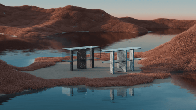 تتكون وحدة التحكم Ksora من ثلاث كتل رخامية مستطيلة تمر عبر صندوق زجاجي مقسى يعمل كسطح للعرض. يوفر الصندوق غير المرئي إحساسًا بخفة الأشياء الموضوعة بداخله ، بل حتى طافية ، بينما ينتقل الضوء بين الأعمدة الرخامية الغنية.